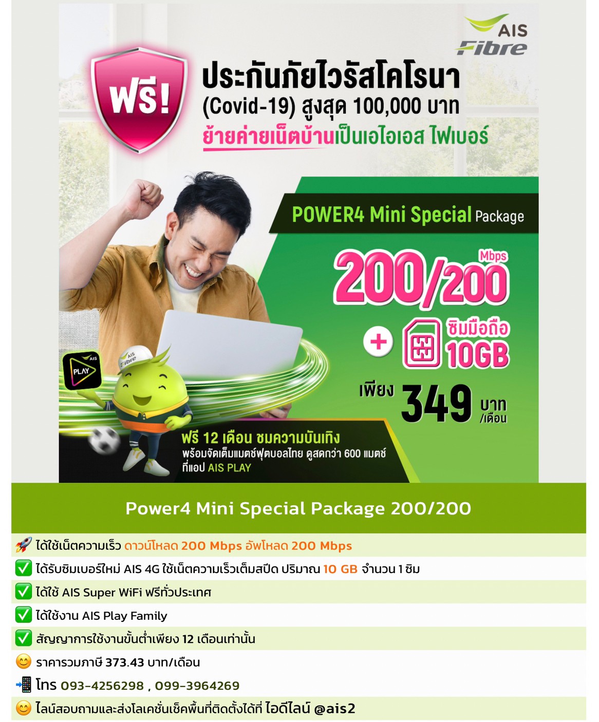 โปรโมชั่นเน็ตบ้านย้ายค่าย AIS Fibre ราคาถูก แพ็กเกจเน็ตบ้านย้ายค่ายราคาเริ่มต้นที่ 349 บาท (ราคา 373.43 รวมภาษี) ความเร็วในการดาวน์โหลดและอัพโหลดที่ 200/200 Mbps เหมาะสำหรับการใช้งาน 1-3 ท่าน พิเศษ! ฟรีซิมเน็ตเบอร์ใหม่จากทาง AIS ปริมาณ 10 GB ที่สามารถใช้งานนอกบ้านได้ คุ้มสุดๆไปเลยอีกทั้งยังได้รับสิทธิ์รับชมรายการช่อง Play Family อีก 10 ช่องนาน 12 เดือน สามารถตรวจสอบพื้นที่ให้บริการพร้อมจองคิวออนไลน์ติดตั้งได้ที่ Line @ais1 และ @ais2