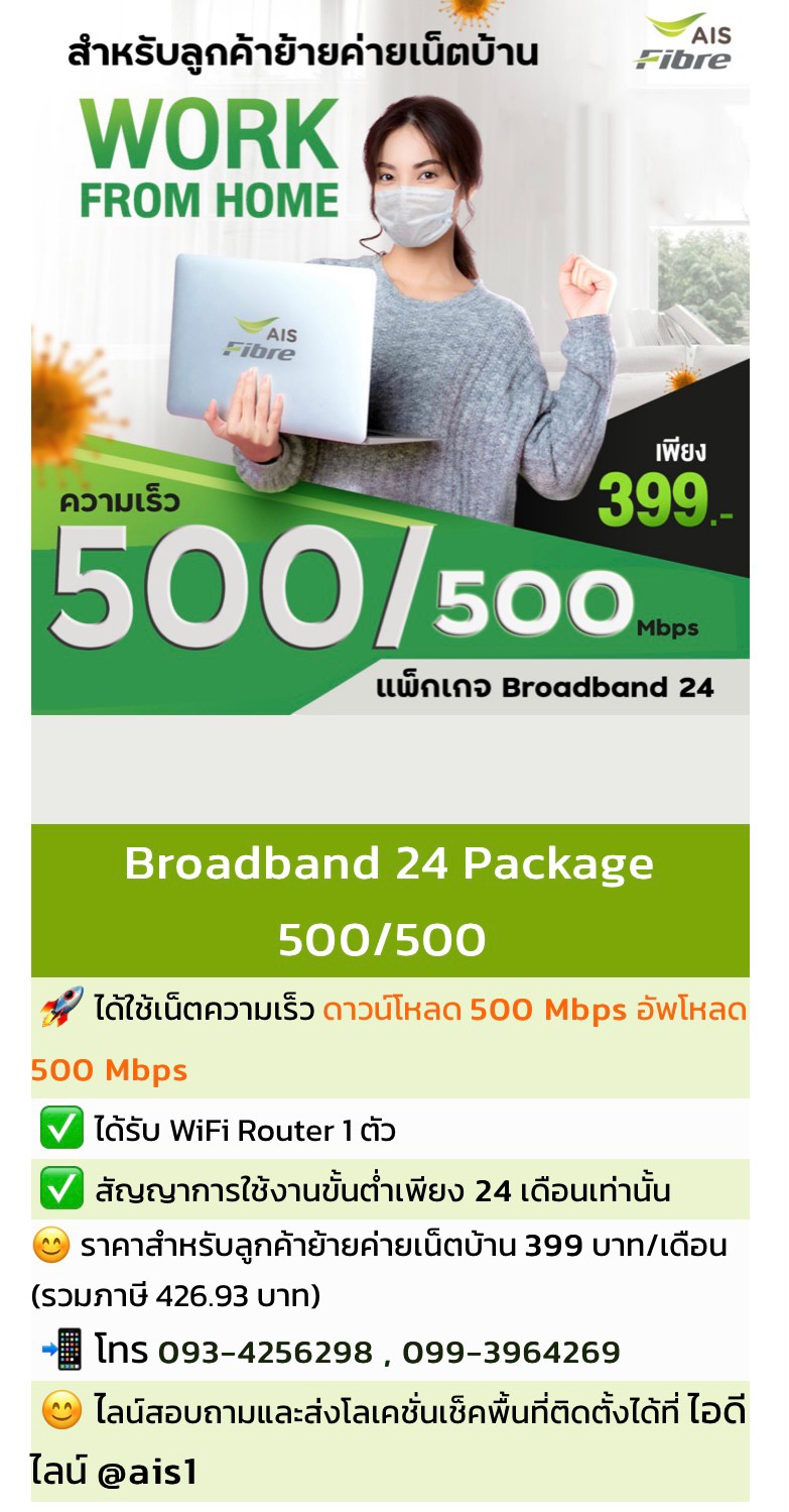 เน็ตบ้าน AIS ย้ายค่าย แพ็กเกจเน็ตบ้าน AIS ย้ายค่ายสุดคุ้ม! กับความเร็วในการดาวน์โหลดและอัพโหลด 500/500 mbps ในราคาพิเศษเพียง 399 บาท (ไม่รวมภาษี) สัญญาการใช้งาน 24 เดือน จ่ายราคานี้ตลอด 24 เดือนคุ้มยาวๆไปเลย! ทั้งนี้สามารถปรับสปีดการใช้งานหรือที่เรียกว่าปรับสปีด Toggle ได้ฟรีผ่านแอพพลิเคชั่น MY AIS ได้ด้วย บอกเลยคุ้มสุดๆ! (พิเศษสมัครในนามบุคคลธรรมดาหรือนิติบุคคลก็ได้)