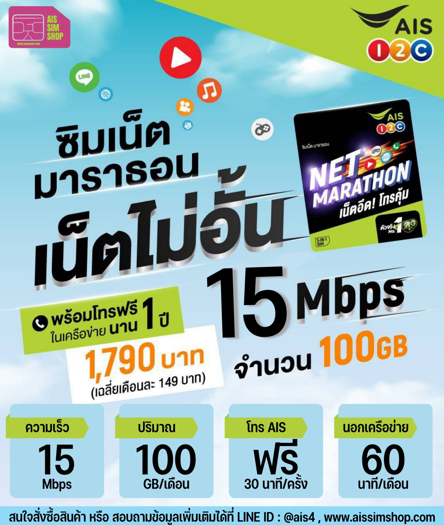 ใหม่! ซิมเน็ตรายปี AIS ซิมมาราธอนเน็ตเร็ว 15Mbps จำนวน 100 GB